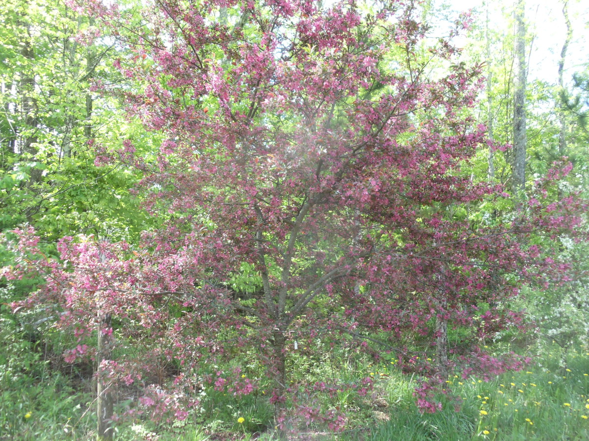 Heavy annual blooms of single purple-pink flowers. Purple-bronze foliage. ½" blue-purple persistent fruit for the birds. Small round spreading slightly disheveled tree with nice open branch structure.