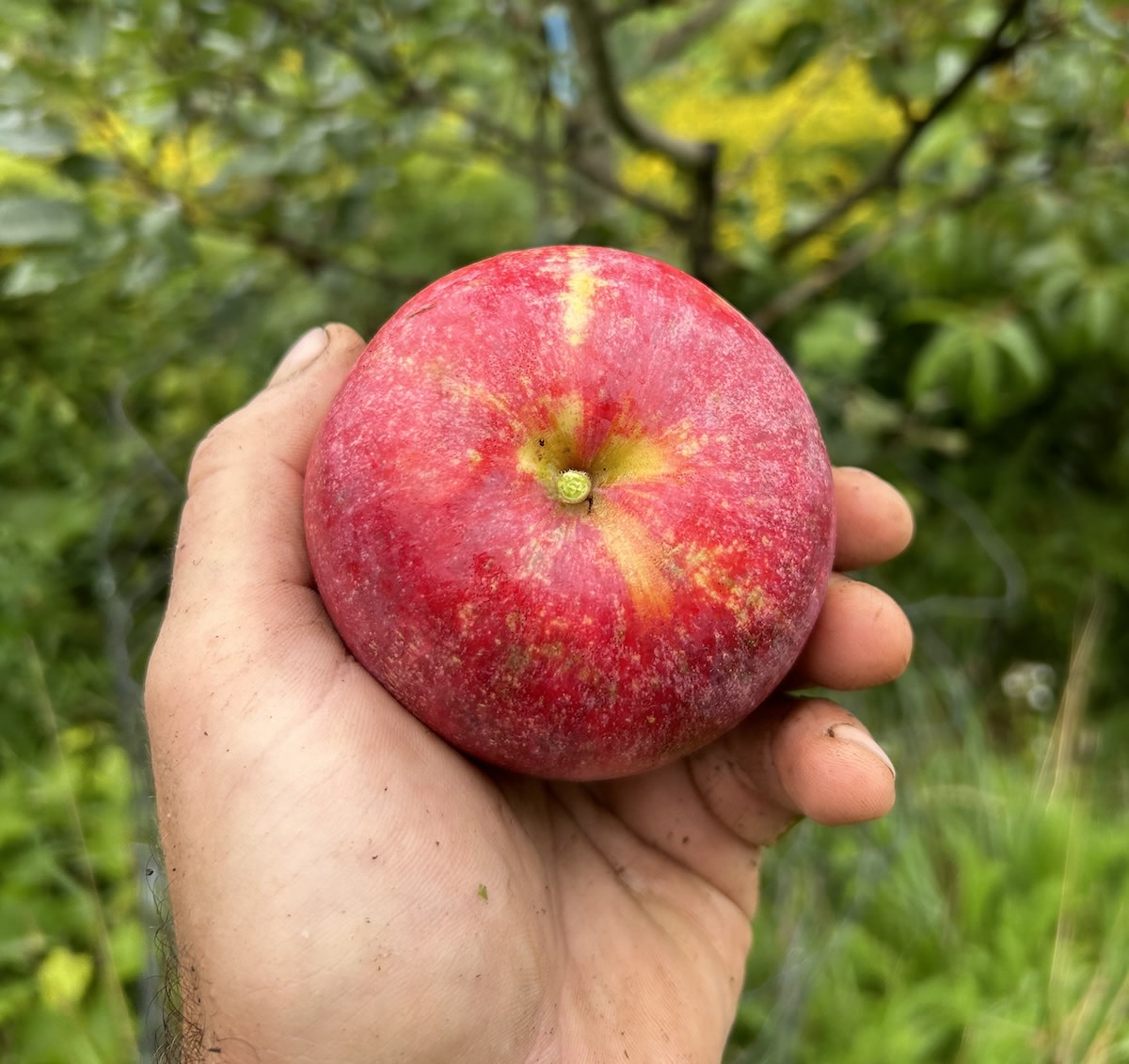 The standard Maine summer cooking apple for generations. Still found occasionally in old Maine dooryards. Juicy rich subacid white flesh frequently tinged with red makes a highly colored sauce. Especially loved for its distinctive flavor in pies. Medium-sized somewhat oblate fruit, splashed or sometimes solidly covered with dark red. An obvious russet patch surrounds the stem. Looks like a junior version of a Wolf River.