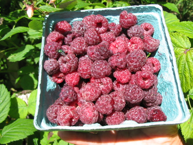 Their distinctive flavor is different from the red raspberries, with a hint of black raspberry. A favorite for fresh eating among those who know it. Cohesive fairly firm large berries make outstanding jam and jelly, too. Extremely robust minimally suckering plants are very productive and open-formed; the berries are eye-level and easy to pick. Ready to harvest when they are deep purple, somewhat later than the reds. Plant in hills.