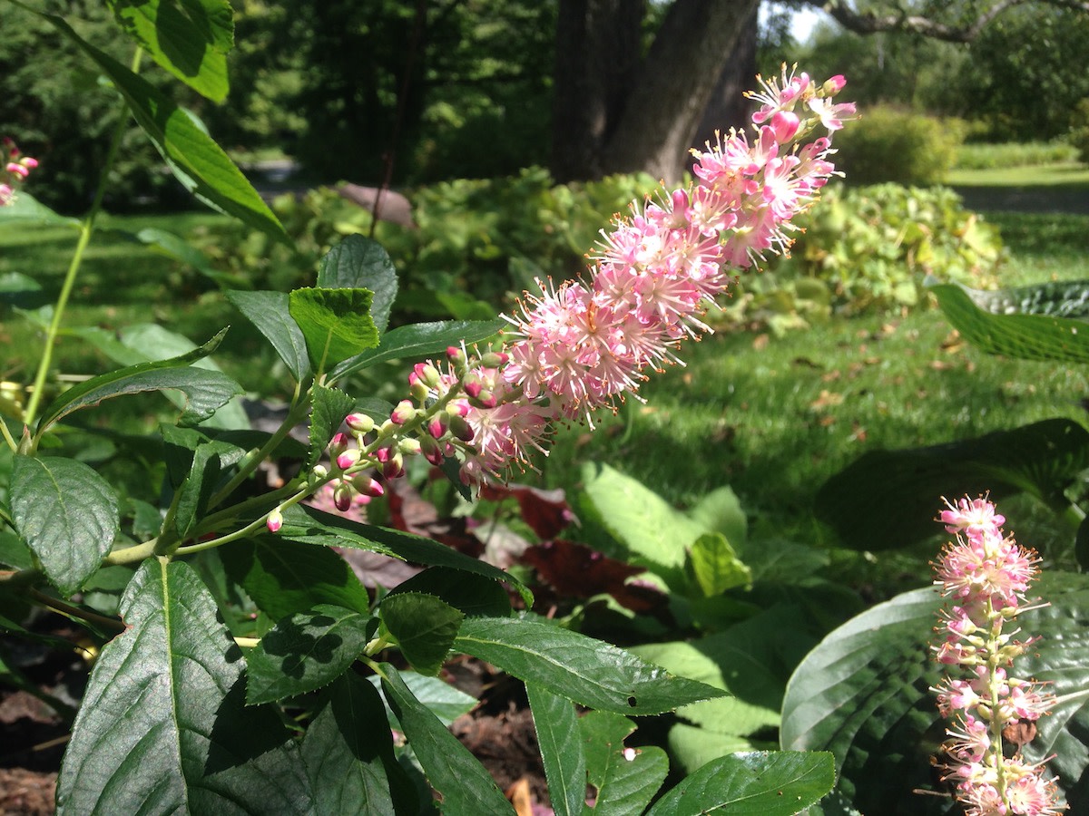4-5' × same. Sport of ‘Pink Spires.’ Broken Arrow Nursery, Hamden, Conn., 1992.Also known as Sweet Pepperbush. Red buds and beautiful spires of heavenly scented deep-pink flowers appear on racemes for six weeks in midsummer. Bees and butterflies love it. Whorls of extremely attractive finely serrated distinctly veined glossy dark green foliage turn deep gold in fall. Dangling racemes of “black peppercorns” persist into the next growing season.