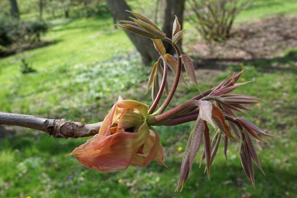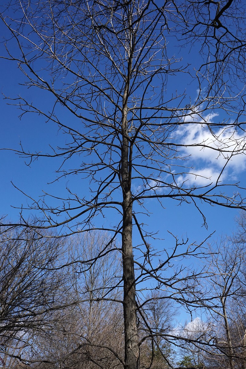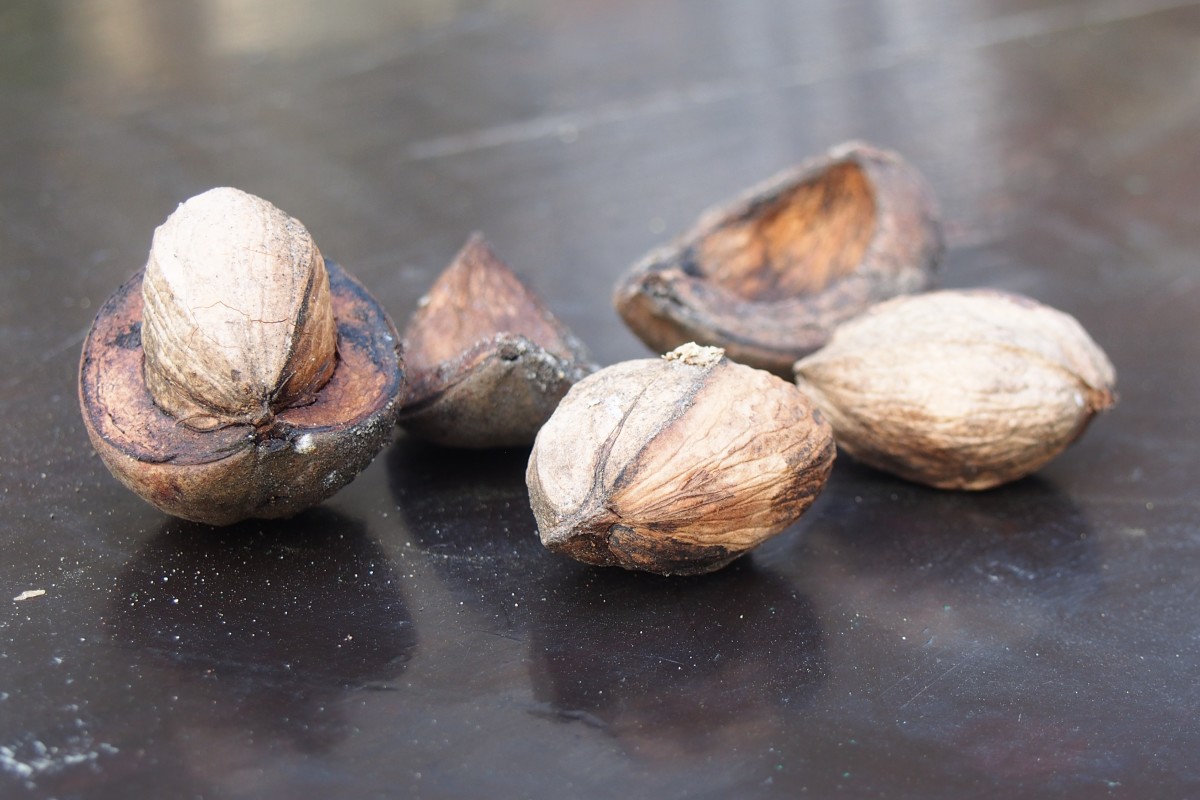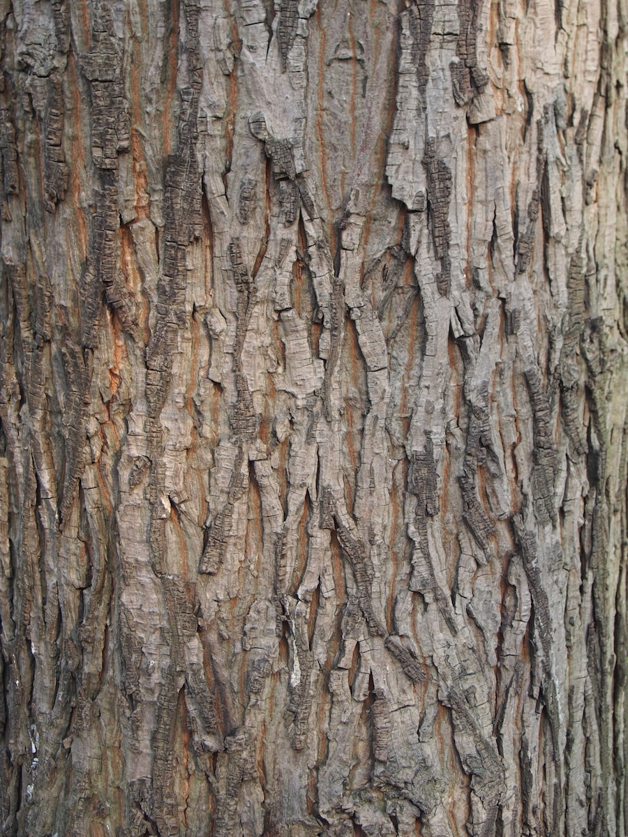 60-80' × 40-60'. Tall with a distinctly narrow crown resembles shagbark hickory but with somewhat less shaggy bark though it also exfoliates in strips when mature. Fruit husks are a bit thicker and shells are larger than its cousin’s but still valued by humans and wildlife. A tree of bottomlands and floodplains, it prefers rich damp soils and tolerates seasonal flooding. Dark green odd-pinnate compound leaves with 4–8" leaflets are yellow or brown in fall.