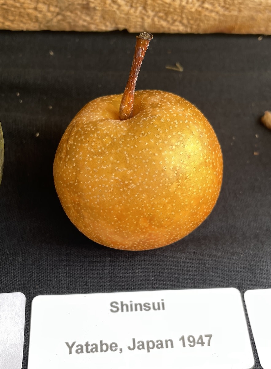 Medium-sized round-oblate yellowish-brown russeted fruit with crisp juicy fine-textured very sweet flesh. One of the earliest to ripen each year. Pennsylvania grower and Asian pear aficionado Ike Kerschner considers this a great pear. Keeps about 6 weeks in refrigeration. Shinsui is translated as ‘new water,’ ‘adoration,’ ‘inundation’ and more. It is also the pseudonym of one of Japan’s most famous 20th-c. artists, Ito Shinsui (1888-1972). Z4/5. (3–6' bare-root trees)