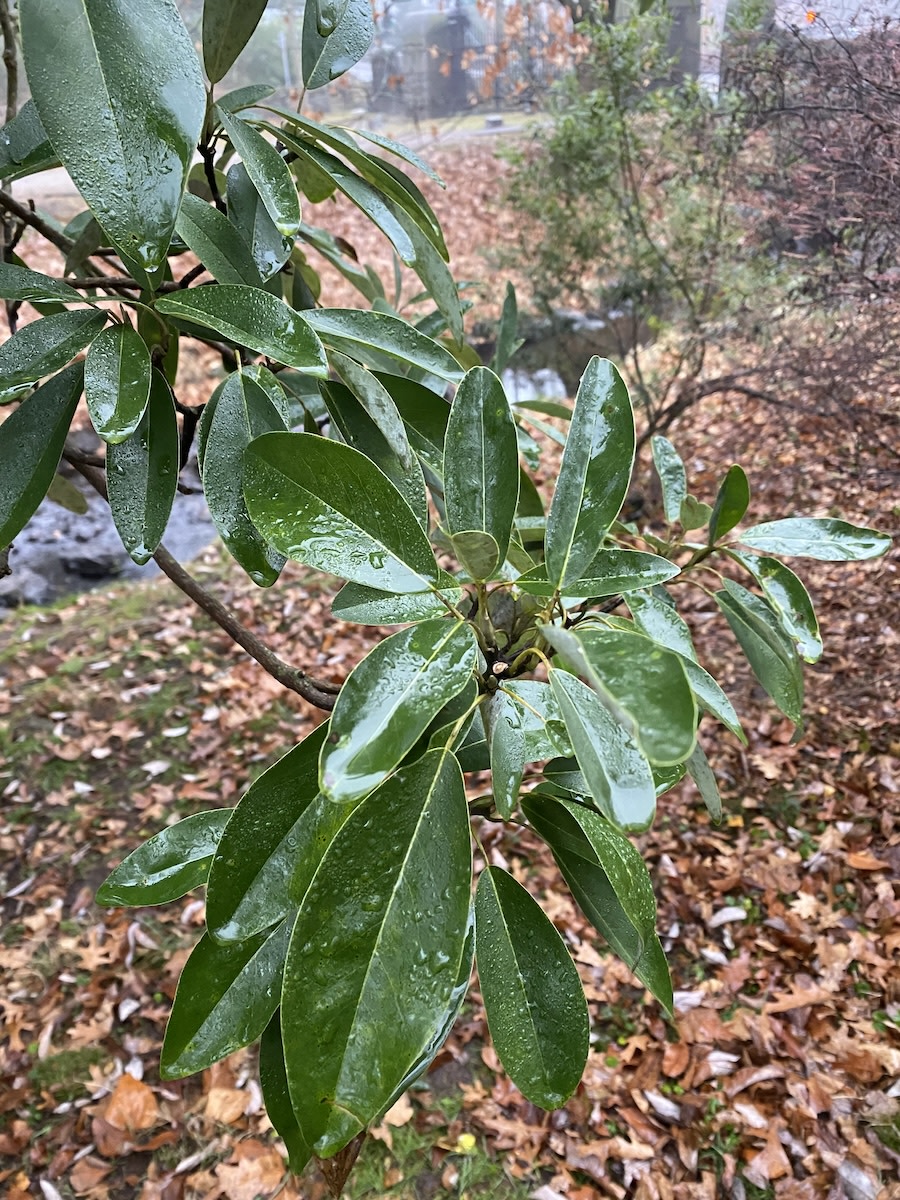Fragrant creamy white 2–3" waxy blossoms in midspring sometimes rebloom in midsummer. Bright green oblong leaves with silver undersides are semi-evergreen in the North where the plant’s form tends toward a large open irregular multi-stemmed shrub; in the South it grows into a tall evergreen shade tree. The impressive specimen we saw at the Arnold Arboretum held its leaves all winter. Pink “fruits” hold bright red seeds and adorn the tree in fall. Happy in acidic damp soil, like at a pond edge, but adaptable to well-drained areas, too. Tolerates clay and air pollution. Full sun to part shade. Native to the southeastern U.S. mid-Atlantic region. Z5.