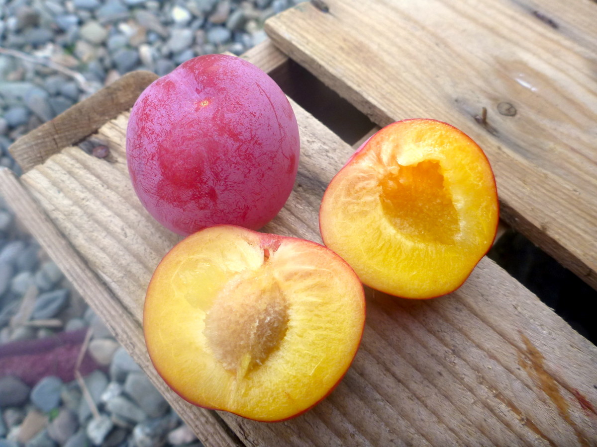 Rosy red fruit, up to 1½" in diameter, mottled with darker purplish-red and covered with a faint bloom. Grower Don Johnson’s comment: “Talk about flavor: candy plum.” Sweet, distinctive, meaty and flavorful. Not real juicy. Somewhat freestone.