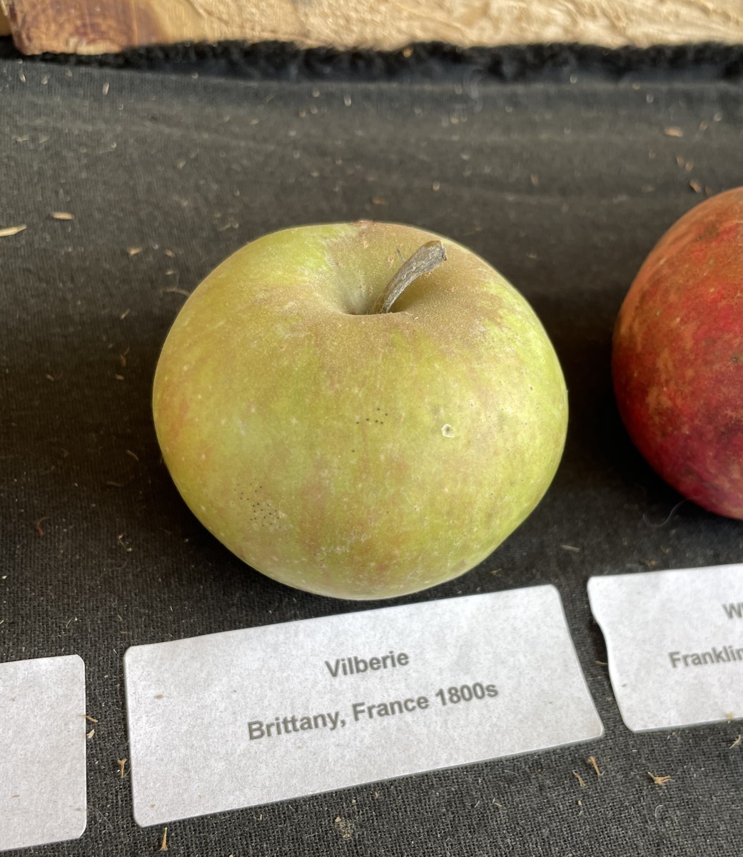 Medium-soft flesh is somewhat spongy with low acidity and a nice astringency. (SG 1.044; acidity 0.27%; tannin 0.41%; Brix 11.5) If you’ve been looking for late-ripening bittersweets as we have been, try this one. We’re excited about it so far. Small-medium fruit is roundish and obscurely ribbed. Resembles Stark and Baldwin, about half covered with a brownish-red blush, with a few short darker red stripes. By mid-October the green has still not begun to turn yellow. The stem is quite long and thin.