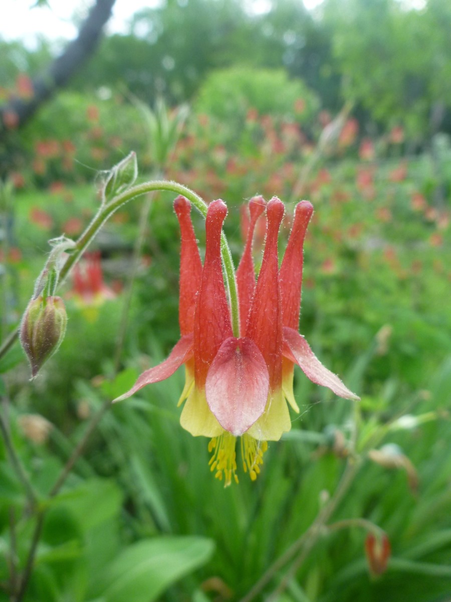 Delightful little stacks of round-lobed leaves emerge in early spring. Soon after, magical jewel-like nodding blossoms with red-spurred sepals and yellow petaled skirts dance above the foliage. The elegant slender spurs are filled with nectar irresistible to hummingbirds. We planted ours at the base of a granite boulder, right alongside some highbush blueberries. The columbines start flowering at the same time as the blueberry bushes, and the rock helps retain even moisture in the soil. Excellent under fruit trees.