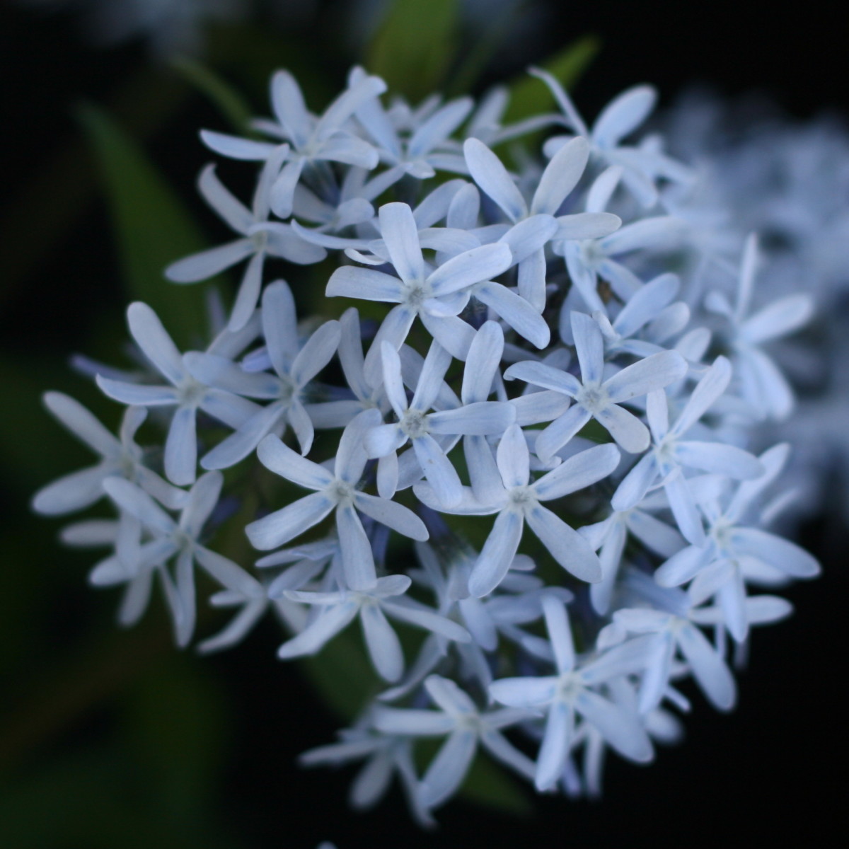 Clusters of deep blue pointed flower buds form in early summer and open into powder-blue star-shaped florets held above deep green fine grassy willow-like foliage. Florets form a tight cluster as if the blossoms were held by self-gravitation, giving it a fantastically unusual appearance that is more chaotic than tidy upon close examination. Gorgeous foliage turns gold in the fall. Best planted en masse. Forms a handsome vase shape at maturity. Looks fabulous with catmint and irises.
