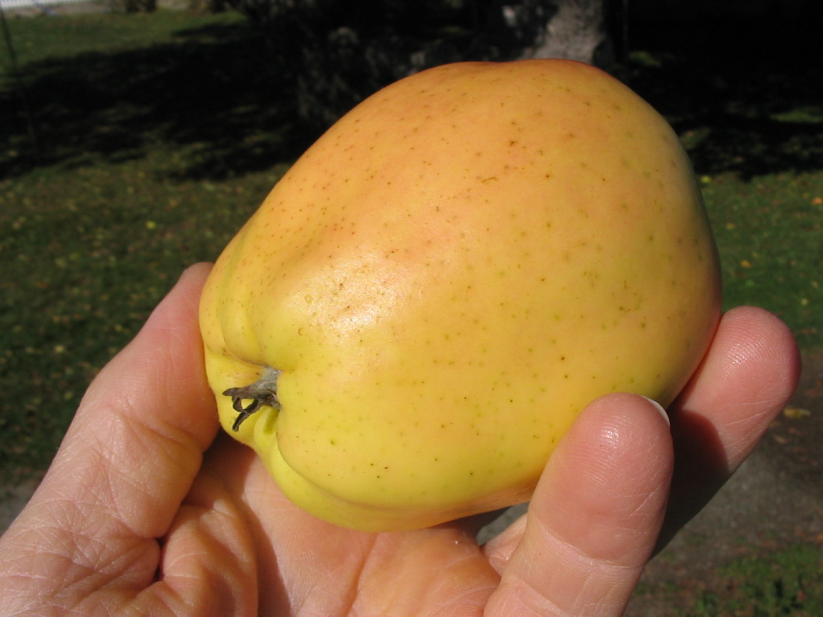 Large conical pure-yellow fruit does everything well, including keeping all winter in the root cellar. Firm, crisp, moderately fine-grained, rather tender, juicy, aromatic, very good for culinary use and good for fresh eating, especially after it’s mellowed for a month or two. Excellent for pies. Applesauce cooks quickly, somewhat coarse, bright glistening yellow with great flavor and chewy skins. We also love it dried: it’s balanced and flavorful.