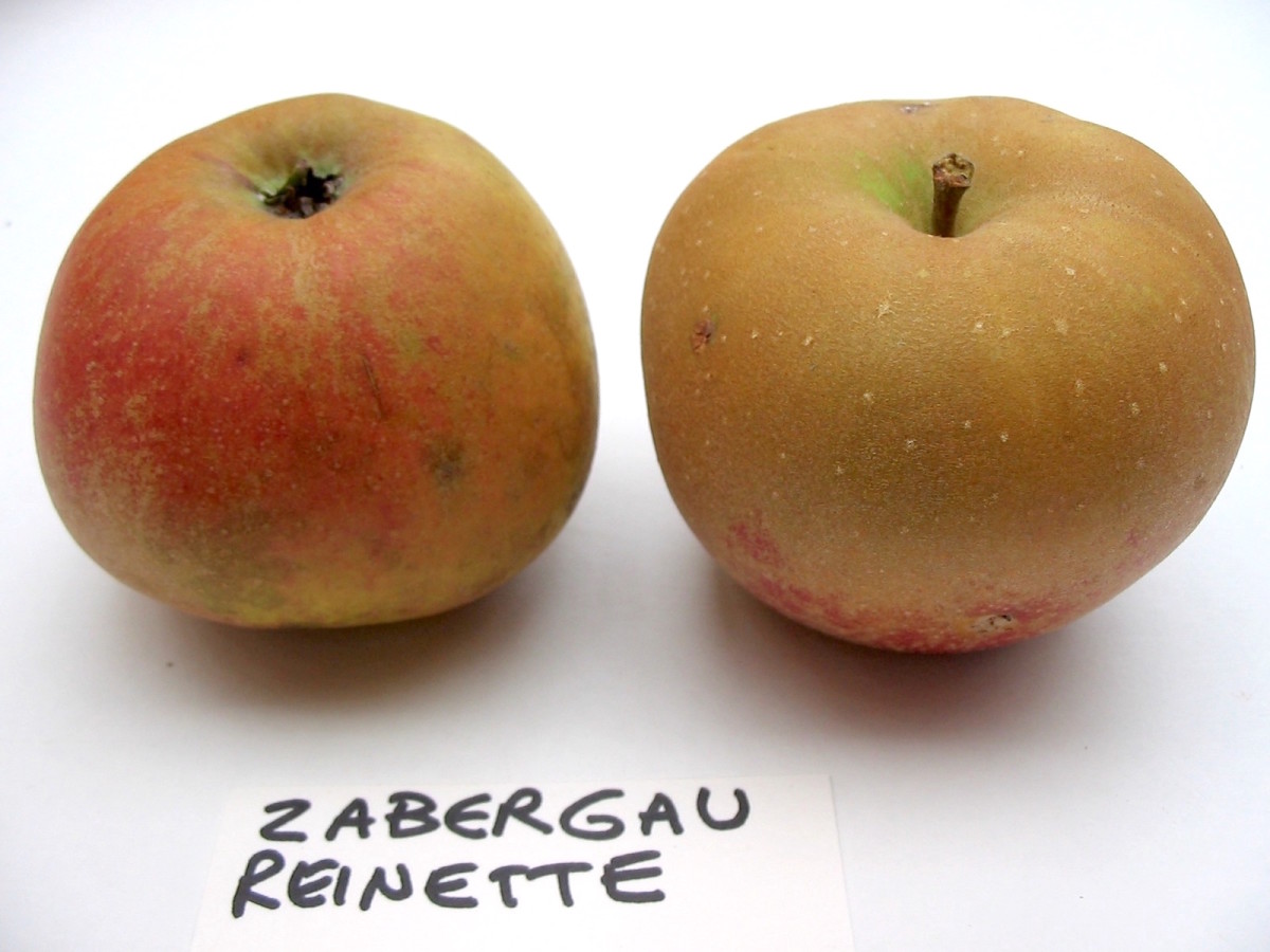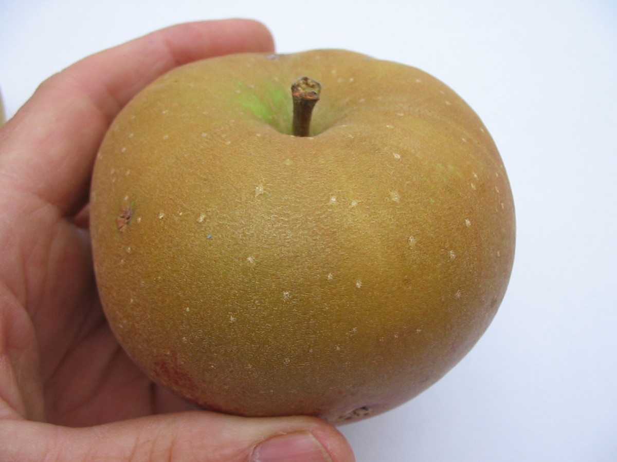 Excellent fresh eating and good for cooking. Very large, sometimes huge, round-conic, sometimes lopsided, greenish-bronze russeted fruit with a red-orange blush. Similar to Pomme Grise in color, but much larger. Quite visible whitish russet spots cover the entire fruit. A very attractive apple. Firm white fine-grained flesh with a rich nutty intense sweet-sharp flavor—fruity with hints of raspberry. Keeps well until midwinter and sweetens up in storage.