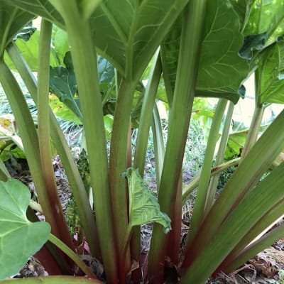 Rheum rhabarbarum Heirloom variety, considered the most important rhubarb variety of the 19th century. Unique seedlings; will show some variation. Z2.