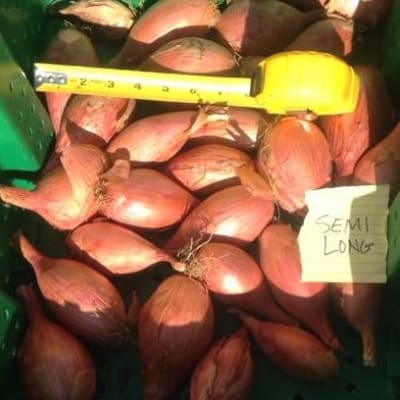 Allium cepa (aggregatum group) (110 days) F-1 hybrid. Lustrous pinky-bronze shallot with elongated 4–5" bulbs that are easy to peel and slice. Sweet and slightly citrusy when raw, also great sautéed.
